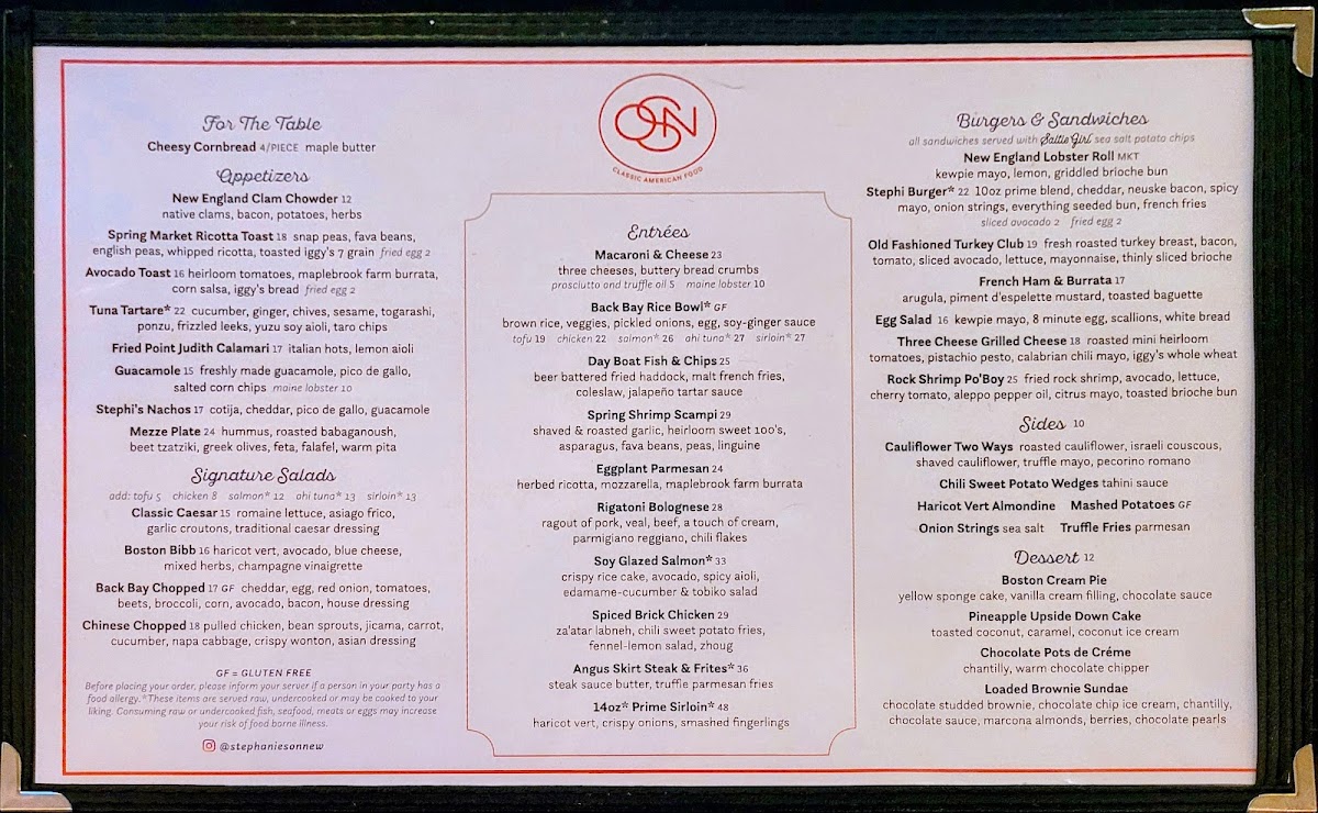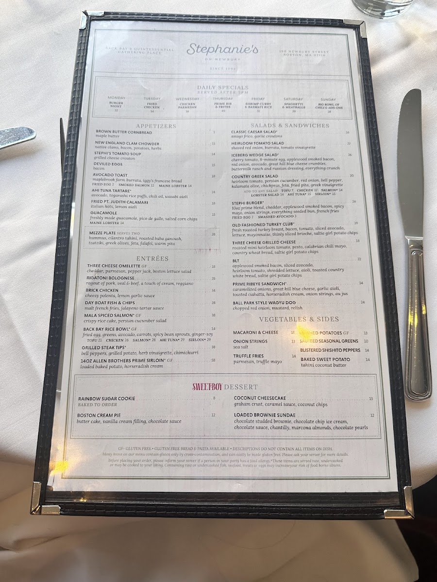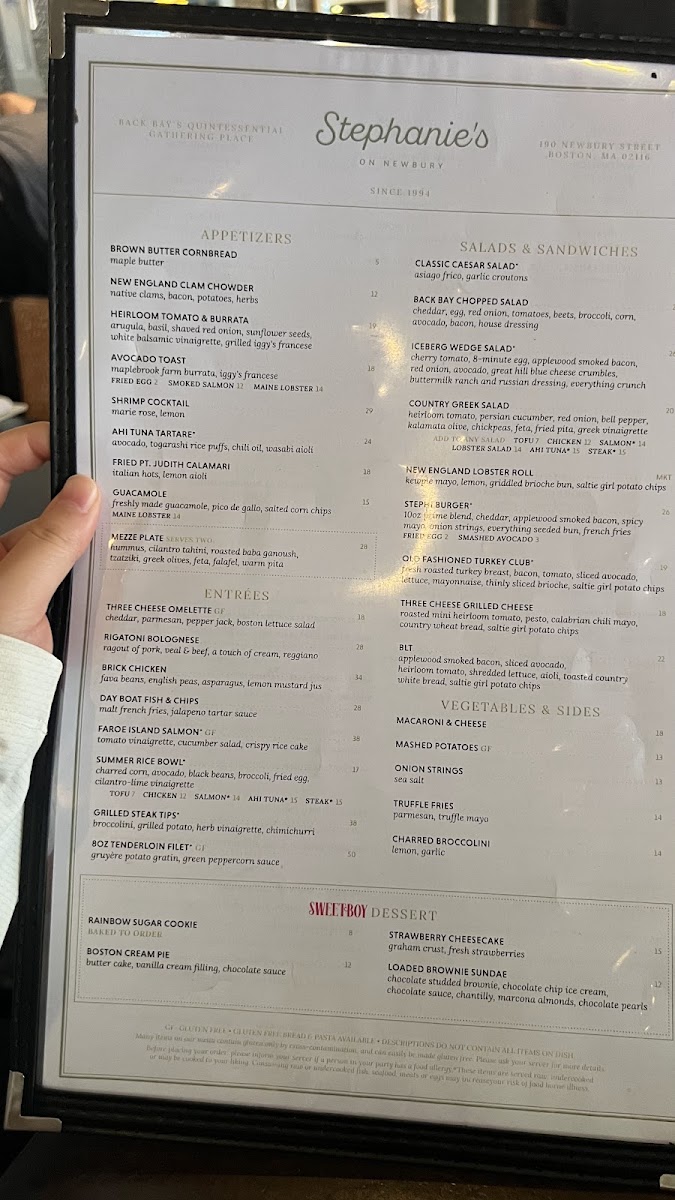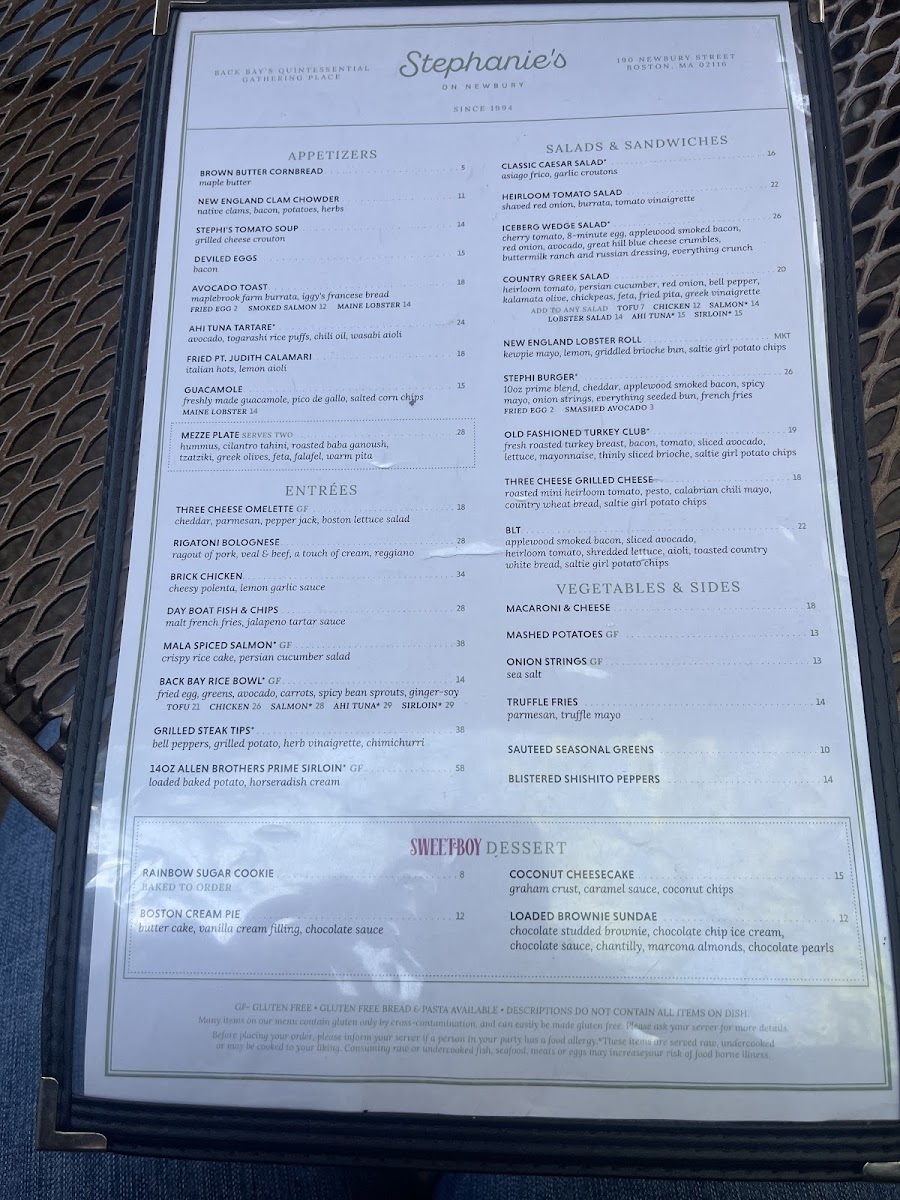 Located in the heart of Boston's vibrant Back Bay on Newbury Street, Stephanie's On Newbury is a quintessential American restaurant that brilliantly fuses comfort and culinary creativity. This dining gem invites you to indulge in a delightful selection of contemporary American fare, expertly crafted to appeal to both the traditionalist and the adventurous eater.